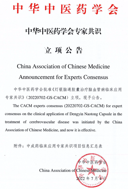 近日,中华中医药学会标准化办公室开展共识集中审查,《灯银脑通胶囊治疗脑血管病临床应用专家共识》成功通过集中审查,目前已予以立项公告。